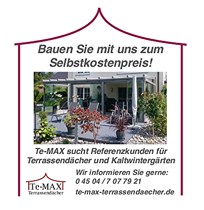 Bitte informieren Sie sich unter 04504 / 7077921 oder per Email unter kunden@te-max-terrassendächer.de Selbstverständlich können Sie sich auch über unser Kontaktformular unter "Kontakt" mit uns in Verbindung setzen.